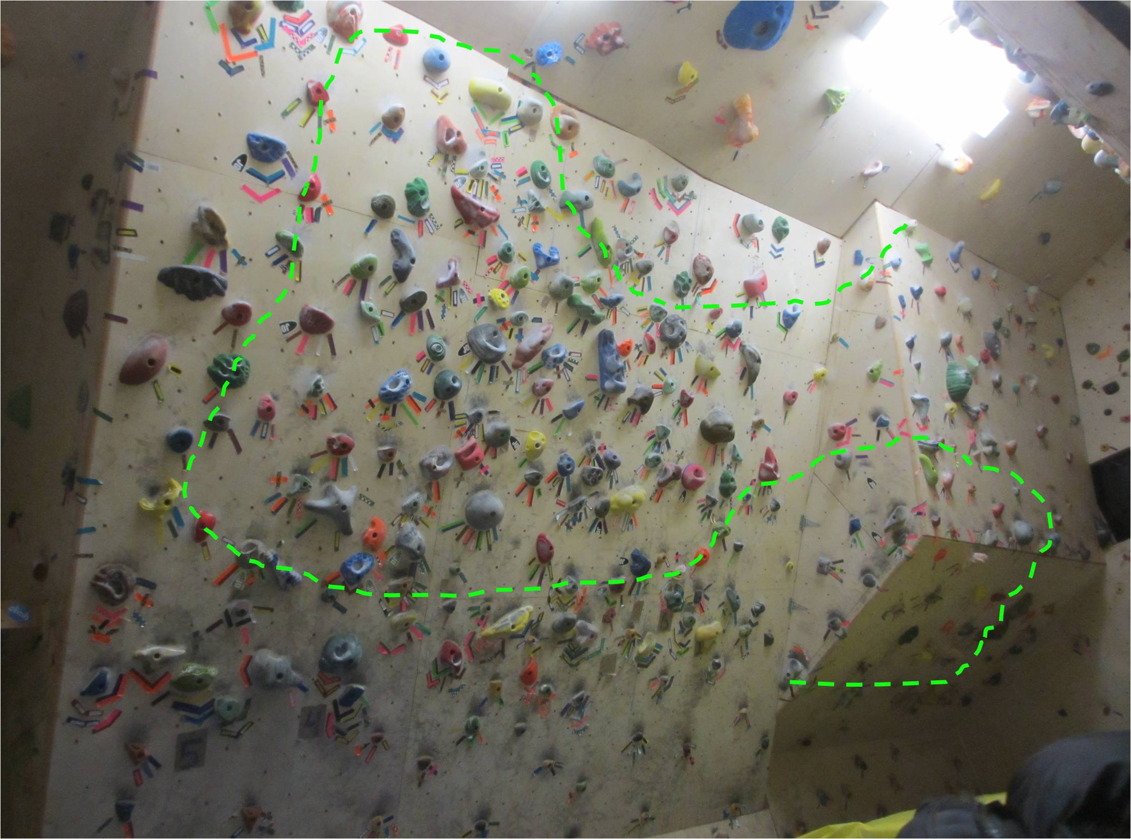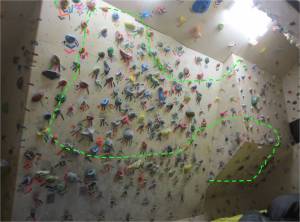 The route is basically a classic power endurance sprint, so it made for a good objective to focus the efforts of my Power Endurance phase. Lately I’ve been experimenting with different types of Interval training, besides the classic “4×4” method that I have extensive experience with. I used a 32-move “route” for my intervals. I did about one workout a week, which consisted of at least 4 laps (but as many as I could do without failing), starting with 4 minutes rest for the first workout. A lap would take a little bit less than 2 minutes to climb, so the work to rest ratio started at about 1:2, with the goal of getting it down to 1:1 by reducing the rest interval by 30 seconds to a minute for each subsequent workout. When I first set this route in the summer of 2010, I couldn’t send it once with several sessions of work. Its very motivating to now see myself sending 5 or 6 times in a 20 minute period!
