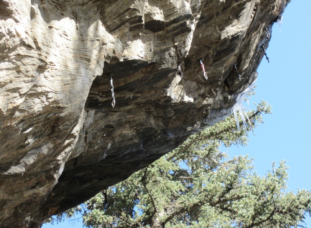 When we arrived I was disheartened to see big icicles coming off the top of Primeval. The wall is so steep it hadn’t really occured to me that seapage might be a problem. The route looked pretty much dry, except for a right hand pinch that sets up the dyno to the big sloping ledge at the end of the Primeval crux, and the last 2 or 3 holds below the chains. I always figure when redpointing its worth a try no matter the conditions, but I had pretty low expectations. The dyno had shut me down on a number of attempts so I couldn’t really see sticking it with a wet hand.