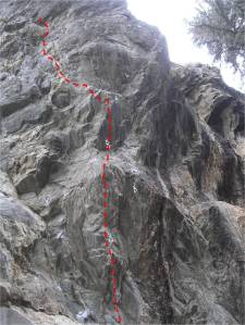 The rock was crisp but not overly-frigid. I flowed through the opening sequence with relative ease. After a risky and strenuous clip the right hand moves to an awkward spike, then a big high step and left hand to a small, sharp crimp. Perch on the righ foot, suck in the hips and then slap the right to the wet pinch. I could feel the water but my hand stuck. Fortunately I’ve dialed this dyno to the point that its virtually static; the key is to keep the feet from cutting loose in order to control the swing…stuck. Dry my hand and shake. Wetness is no longer an issue but the hand is much colder than usual from the water. This is one of those rests that isn’t really that restful, and you wonder if you would be better off sprinting. At only around 10 moves in, you aren’t pumped, just numb. I stay long enough to get most of the feeling back in my hands and press on linking intermittent rails.