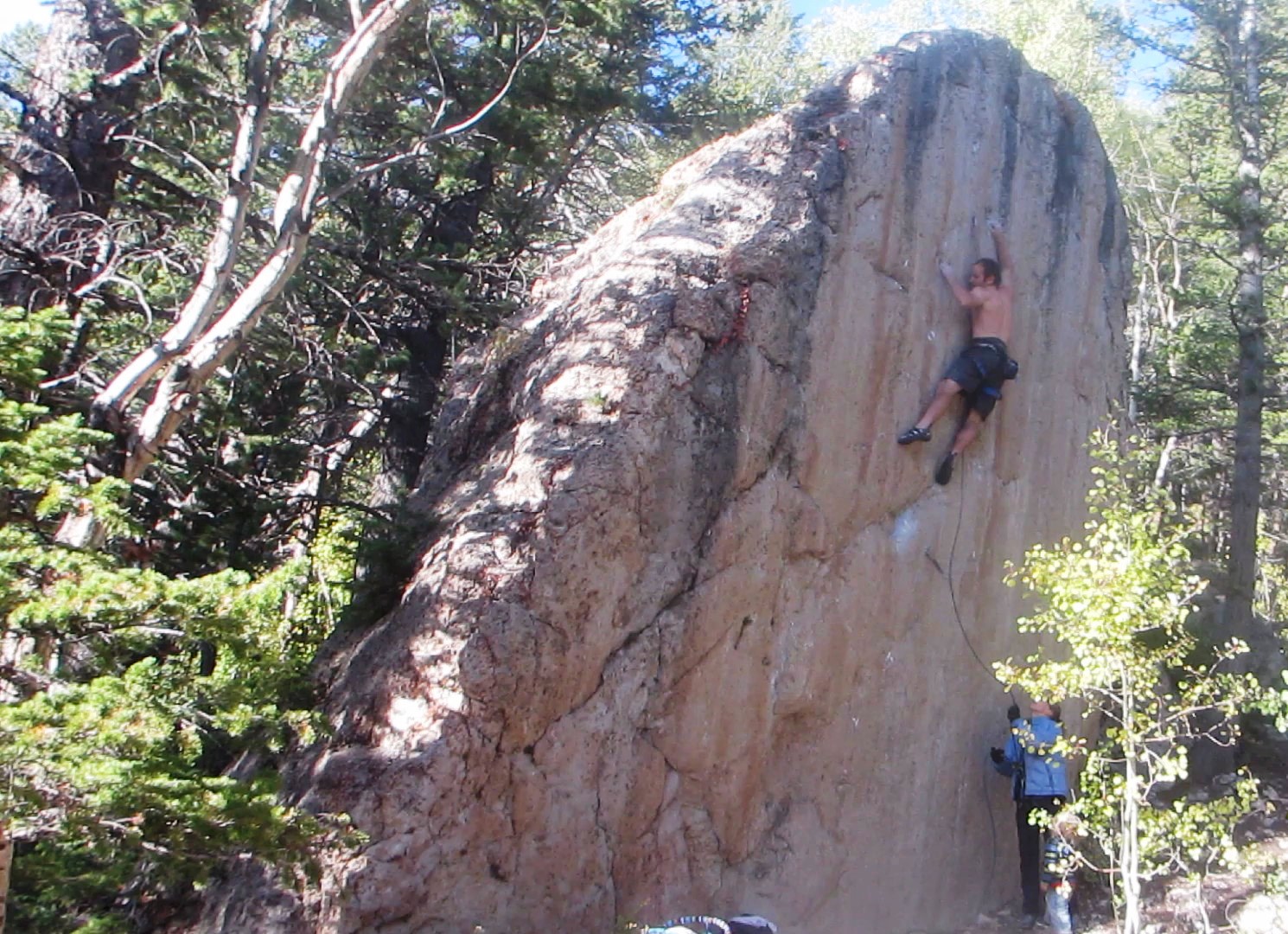 I climbed smoothly up to the rock-over move, and latched the left-hand crimp. The rock was much cooler and the tiny edge now felt much better. I carefully stood up, shifted my hips slightly to the left, and delicately placed my finger into the mono sidepull. I popped my left hand to the four-finger pocket and exhaled. After a quick dab of chalk, I reached the sloping edge, clipped, and clawed my way to the high pockets. I brought up my feet, gunned for the lip, and mantled over the top of the boulder.