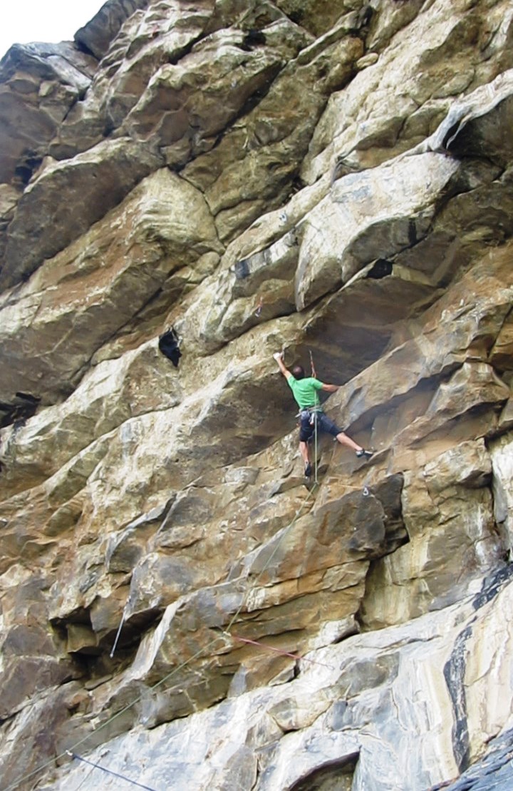 I tried it. With the heel hooked, supporting some of my weight, the holds all worked, and I soon did the problem. Later that week, I went up there again. Chris was there. He had heard me talk about the problem and had fancied a go.