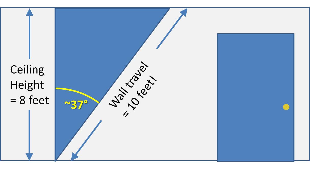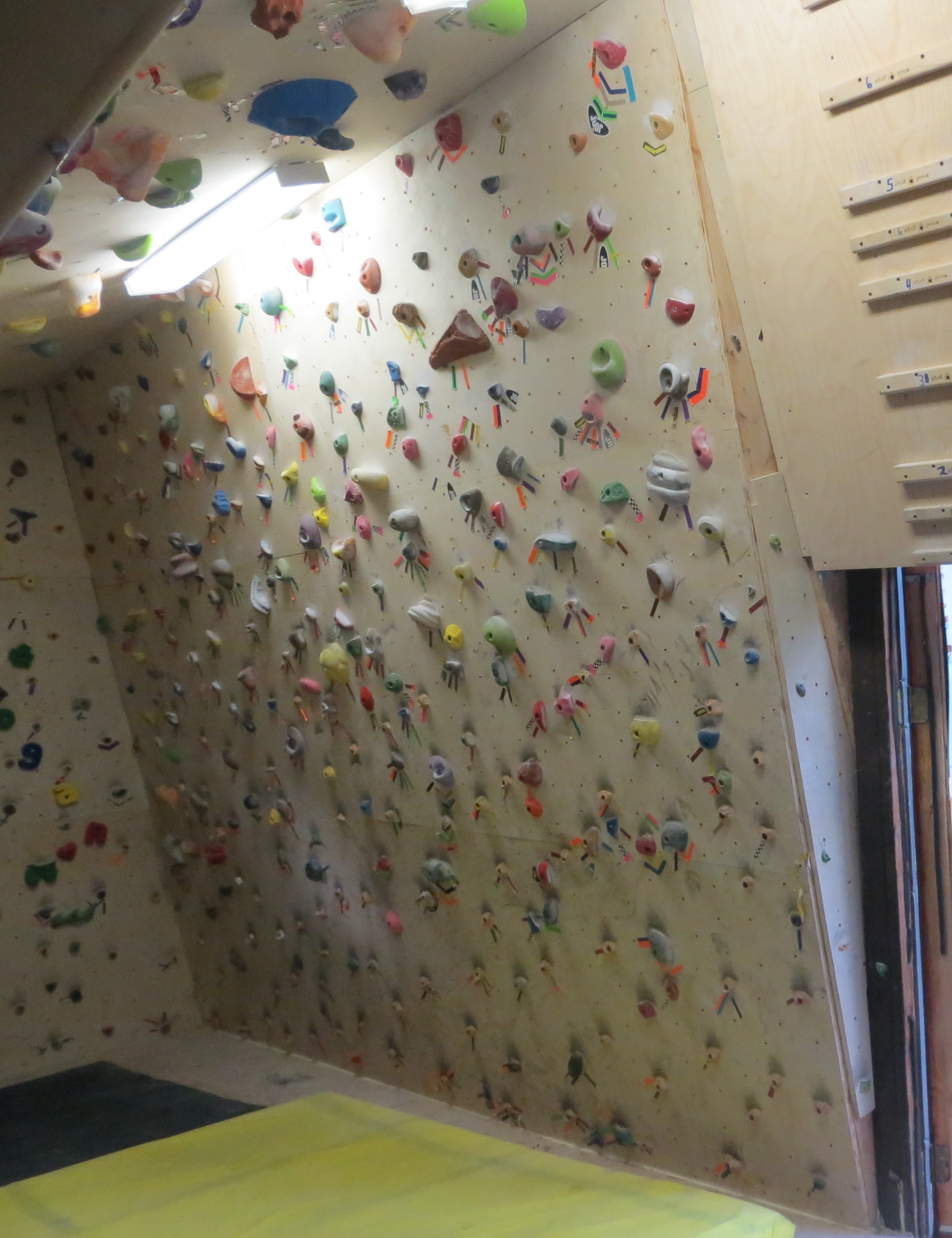 A slightly overhanging wall like this one can be used for both ARCing and Limit Bouldering. Include an assortment of large holds for ARCing, and small, realistic holds for Limit Bouldering. However, the disadvantage of less steep walls is that they will provide less climbing travel (in the direction of the wall) for a given ceiling height.