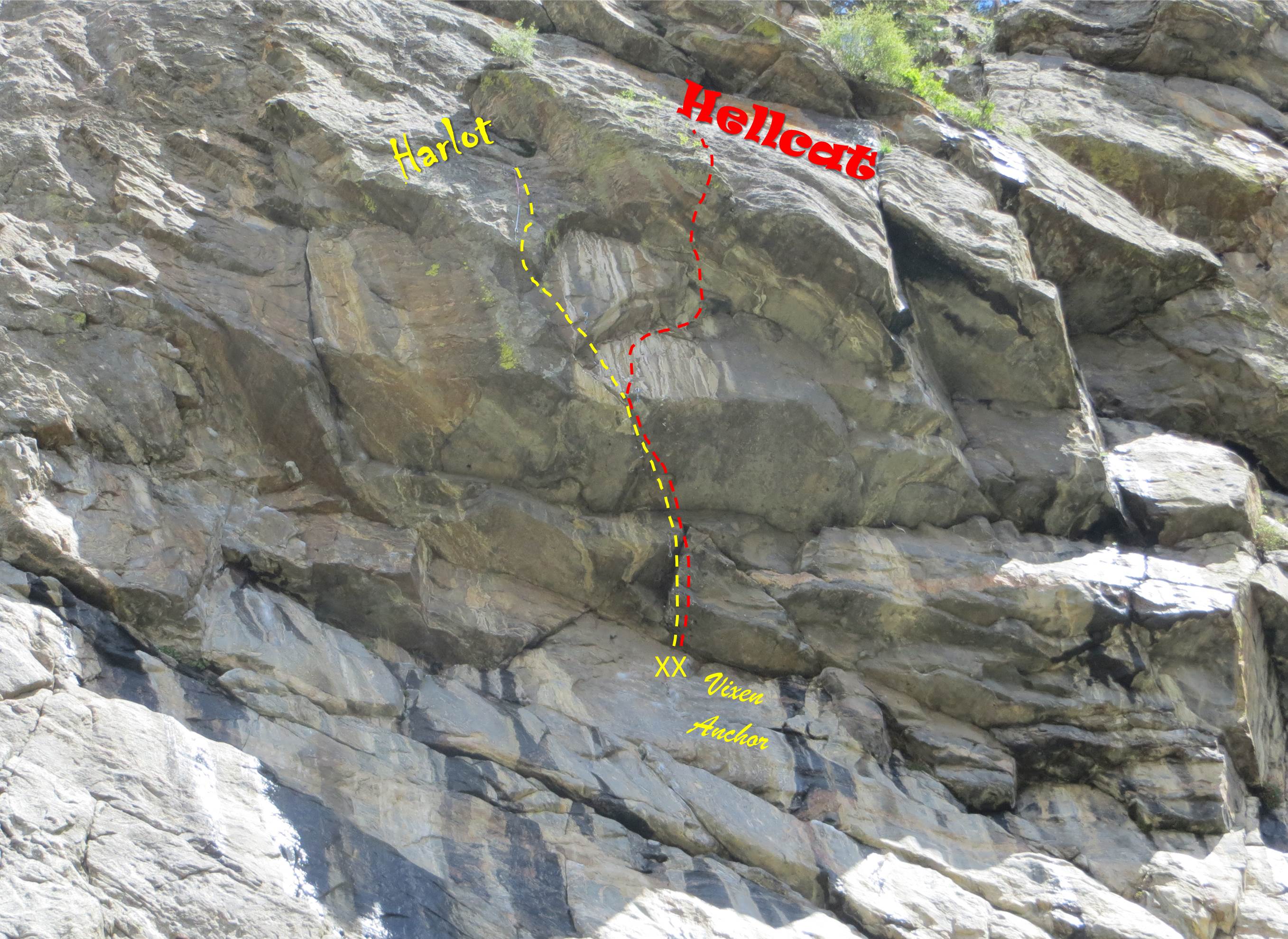 I’m really proud of Hellcat. It’s a spectacular line packed with a lot of great, hard moves. I think its up there with Double Stout as one of the best hard lines in Clear Creek. The rock in the first roof is a bit chossy, and the approach pitch is not nearly as good as Double Stout’s, but the business is far less cruxy, making for a line that is overall much more continuous and pumpy. Hellcat is noticeably harder than Harlot, though it’s hard to say how much so after climbing them back-to-back. Though I don’t think the direct finish adds a full letter-grade of difficulty, I’m calling them .14a and .13d respectively, figuring the latter is a bit hard for the grade and the former a bit easy. Time will tell.