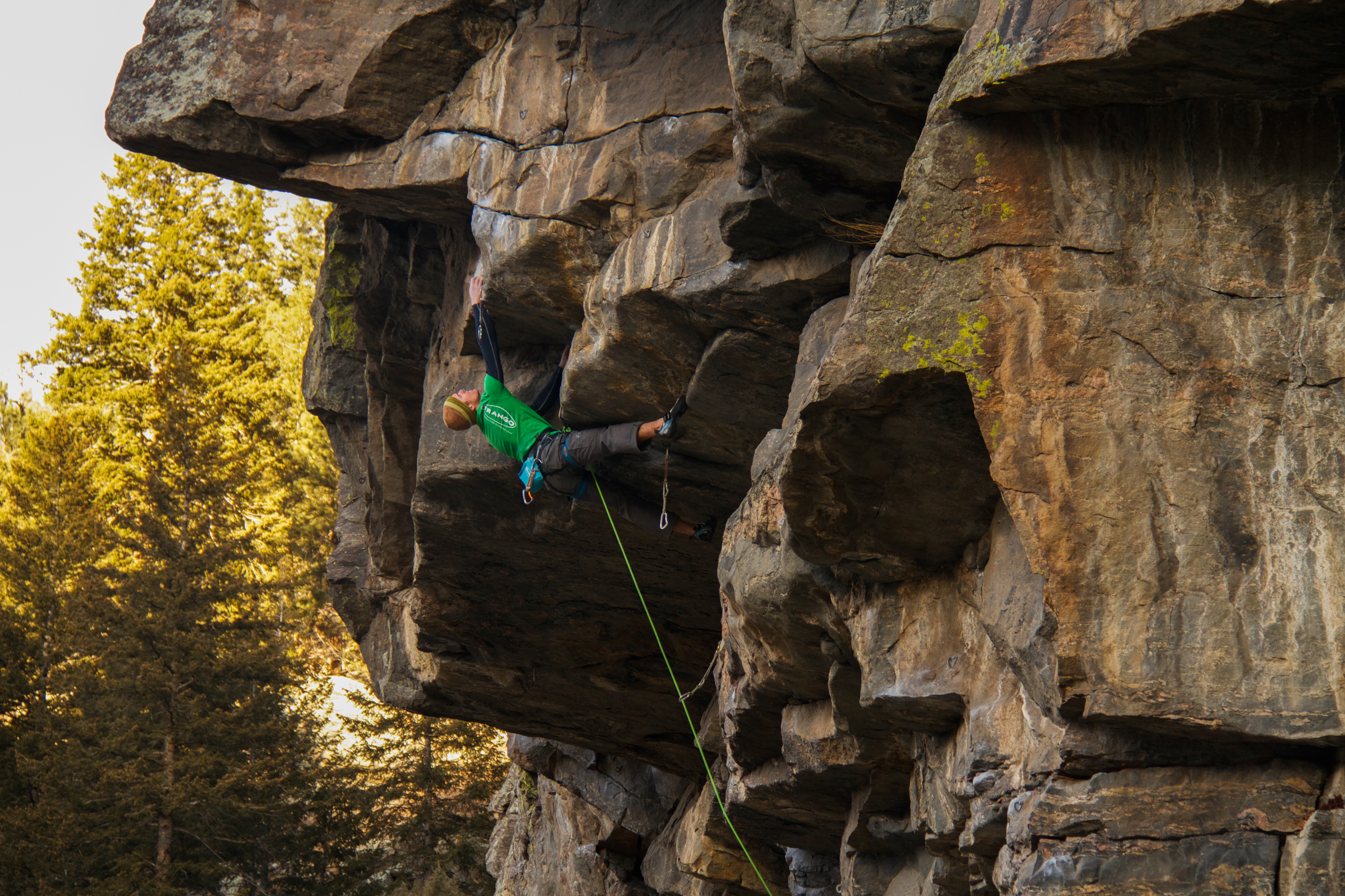 By now I had the first two roofs well-dialed, so on my next redpoint attempt I climbed to the lip of the middle roof with relative ease. The rightward traverse was slightly desperate with a solid pump, so I shook out for quite a while at the rest stance just below the finish. Feeling good, I worked my left hand out to the flat edge, pulled my feet up, leaned out as far as I dared to spy my target, and launched for the finishing jug. From this point, 250-feet above the river and 20-something horizontal feet out from the slab, I threw my foot up and pulled onto the big ledge just below the top of Clear Creek’s finest cliff.