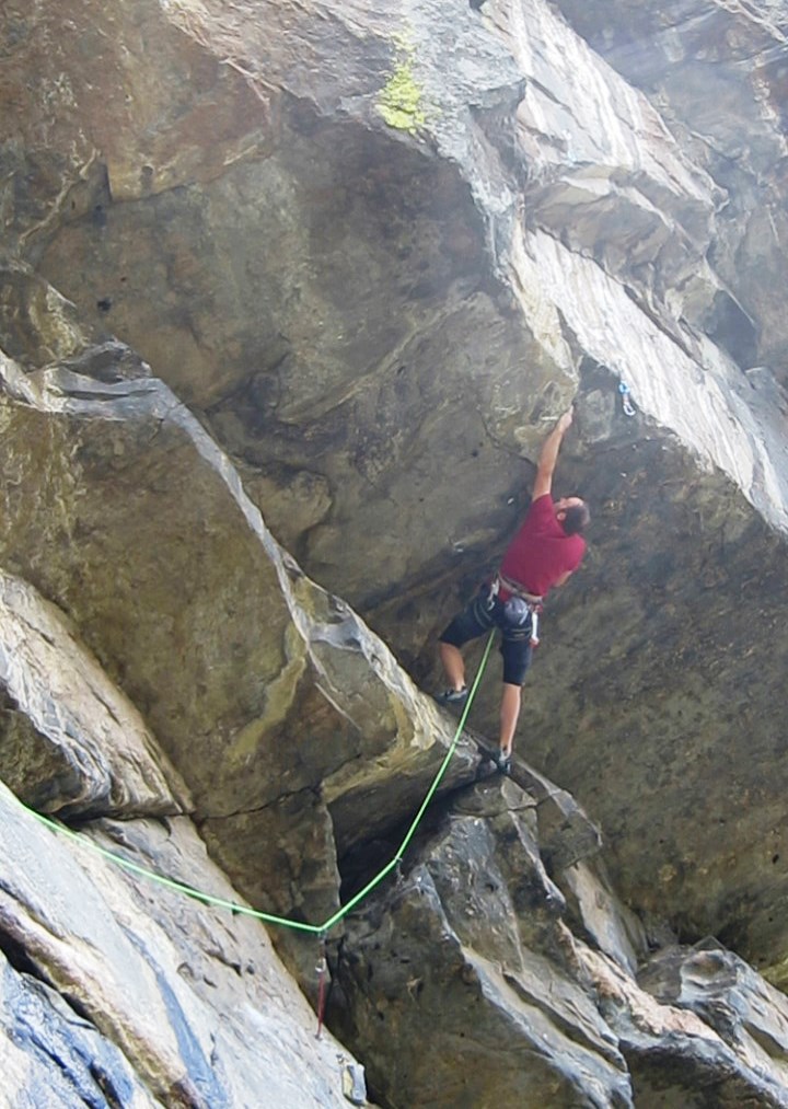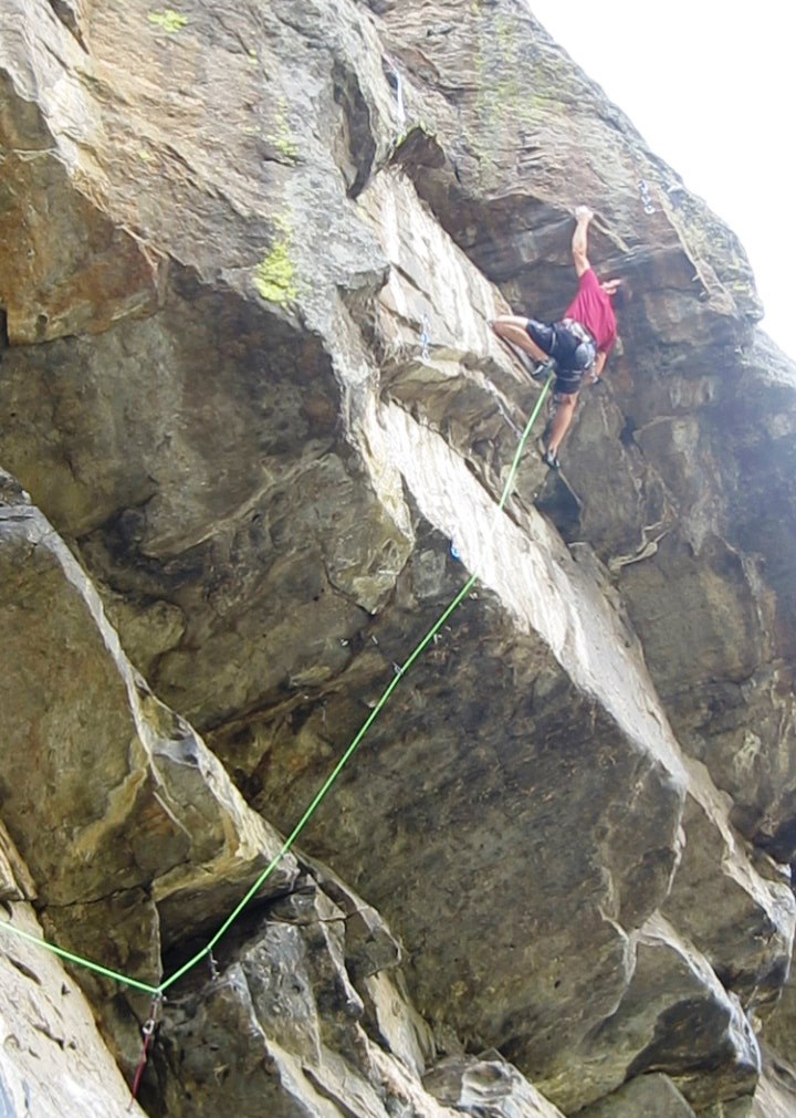 Still, to a certain extent sport climbing is about going out of our way to find challenges, and while Harlot follows the obvious line of weakness, the potential remained to create a directissima—the line a falling drop of water would follow—by heading straight up at the end to confront the final roof. This eight-foot, slanted eave appeared to have a large jug right at the lip, and it seemed likely there were enough features in the roof itself to reach it. While staring at photos on a rest day I became sufficiently convinced the directissima would go, so I gathered my bolt kit and headed up to add three bolts and an anchor.