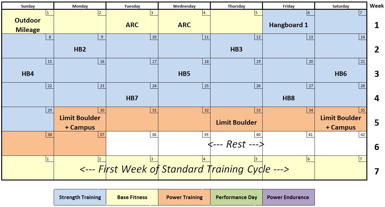 Next consider the relative importance of any short and long term goals. Going back to the original example, let’s say your fall goal route is long and pumpy, but the individual moves are well within your ability. You may want to design your bridge cycle to improve your redpoint endurance, and so emphasize Base Fitness and Power Endurance training. Perhaps your fall goal route is short and bouldery, in which case emphasizing Strength and Power is the way to go.