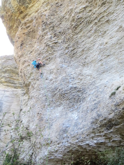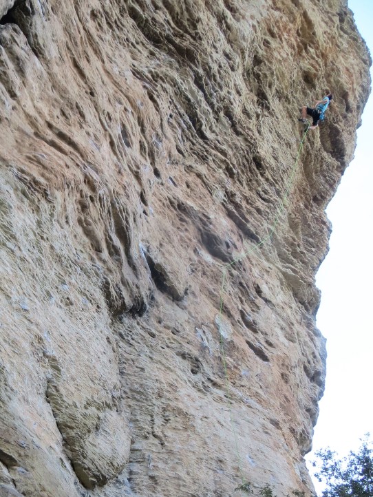 The cliffs of Venasque don’t look remarkable (relative to other crags of the area). There are no tufas, the colors are bland relative to the orange and blue streaks of St Leger and Baume Rousse, and the scenery isn’t particularly special. But man, the climbing sure is fun! The rock is limestone, but it seems to have quite a bit of sandstone mixed in, and it’s weathered in a manner very similar to the best routes at Kentucky’s Red River Gorge. We spent most of our time at “Place de l’Ascle,” the main feature of which is a 30m wall, overhanging up to about 20 degrees, and covered in huge jugs. All the routes on this wall were spectacular 5.12 pumpfests. The routes aren’t particularly striking or cerebral, but it was definitely the most fun I had climbing on our trip.