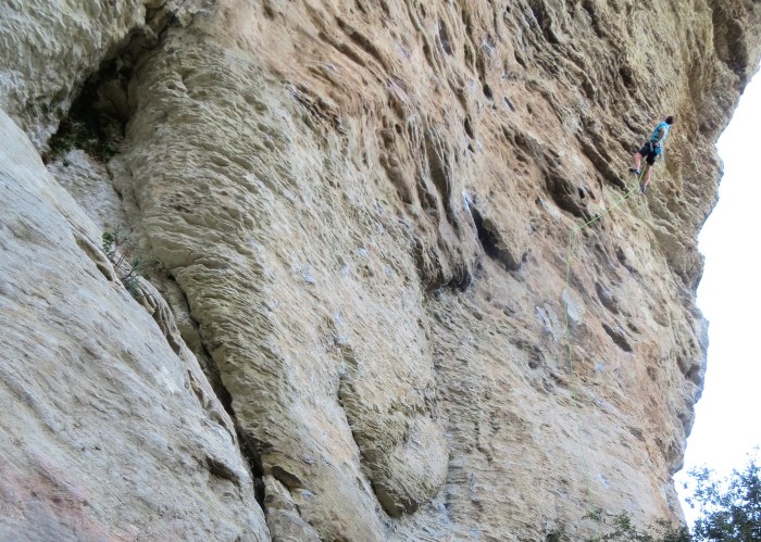 Kate starting up Petite Marie, a gobsmacking 5.11c that charges up the right side of a towering swell of overhanging jugs. 5.11 sport climbs don’t get any better than this.