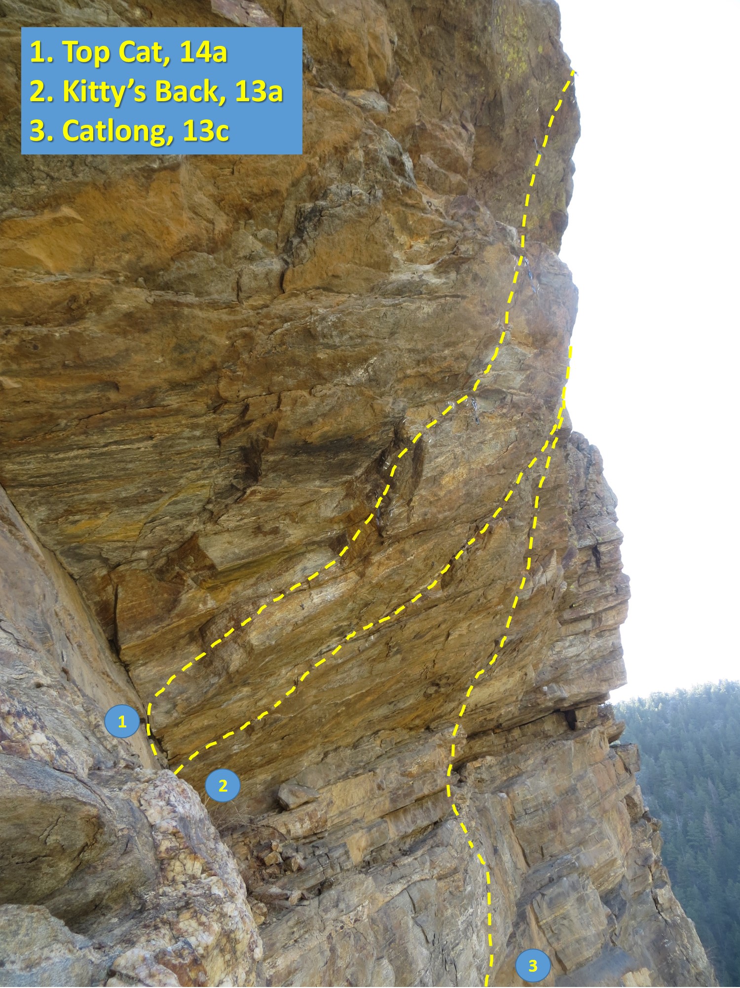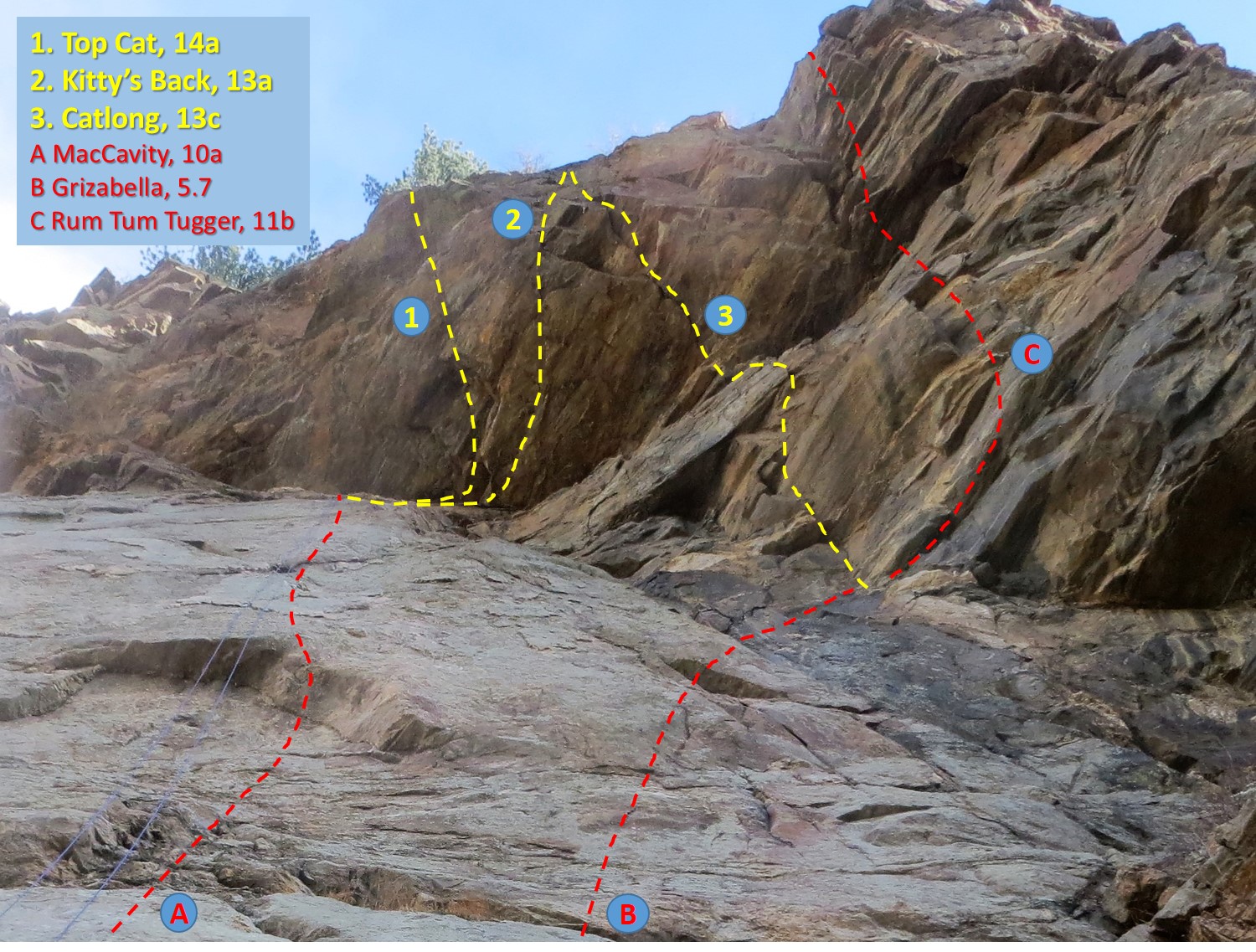The final route, Top Cat, is the furthest left. Against all odds it turned out to be the best, with good rock throughout, and really fun, athletic climbing. It’s also the hardest, with two difficult dynos. The most powerful move is a burly stab to a half-pad crimp at the second bolt, after which heel hooks and big lock-offs between good-for-the-grade holds lead into the redpoint crux–a crossing drive-by to reach the 4th bolt. Although it’s short, it’s completely sustained from the moment you step off the slab. I think its at the low end 5.14a.