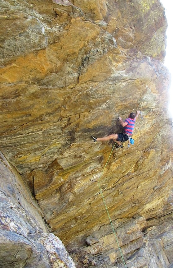 Over the winter I bolted three routes on the steep visor that sits high above the “Catslab” in upper Clear Creek. This feature looks like a roof from the ground, but it’s more like a convex bulge, gradually sweeping from about 60-degrees overhanging at the base up to ~30 degrees at the top. The business overhangs right around 45-degrees.