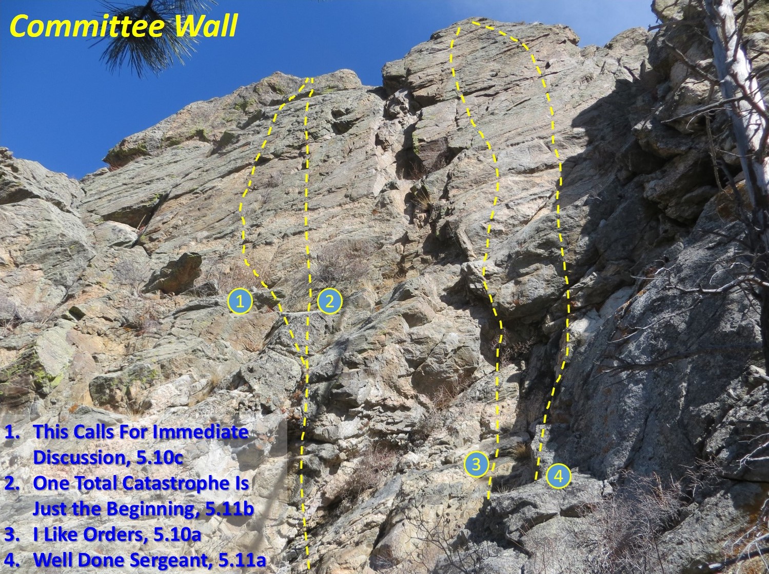 The formation is massive, and has cliffs facing in just about every direction, but the best cliffs are generally west-facing, staying in the shade till around noon. There are currently two developed sectors which are a few hundred feet apart. The lower, northern-most wall, dubbed the “Committee Wall” consists of long-ish, more or less vertical panels of solid, well-featured rock. The routes on this wall are in the 5.10- to 5.11 range, with generally consistent difficulty and fun climbing.