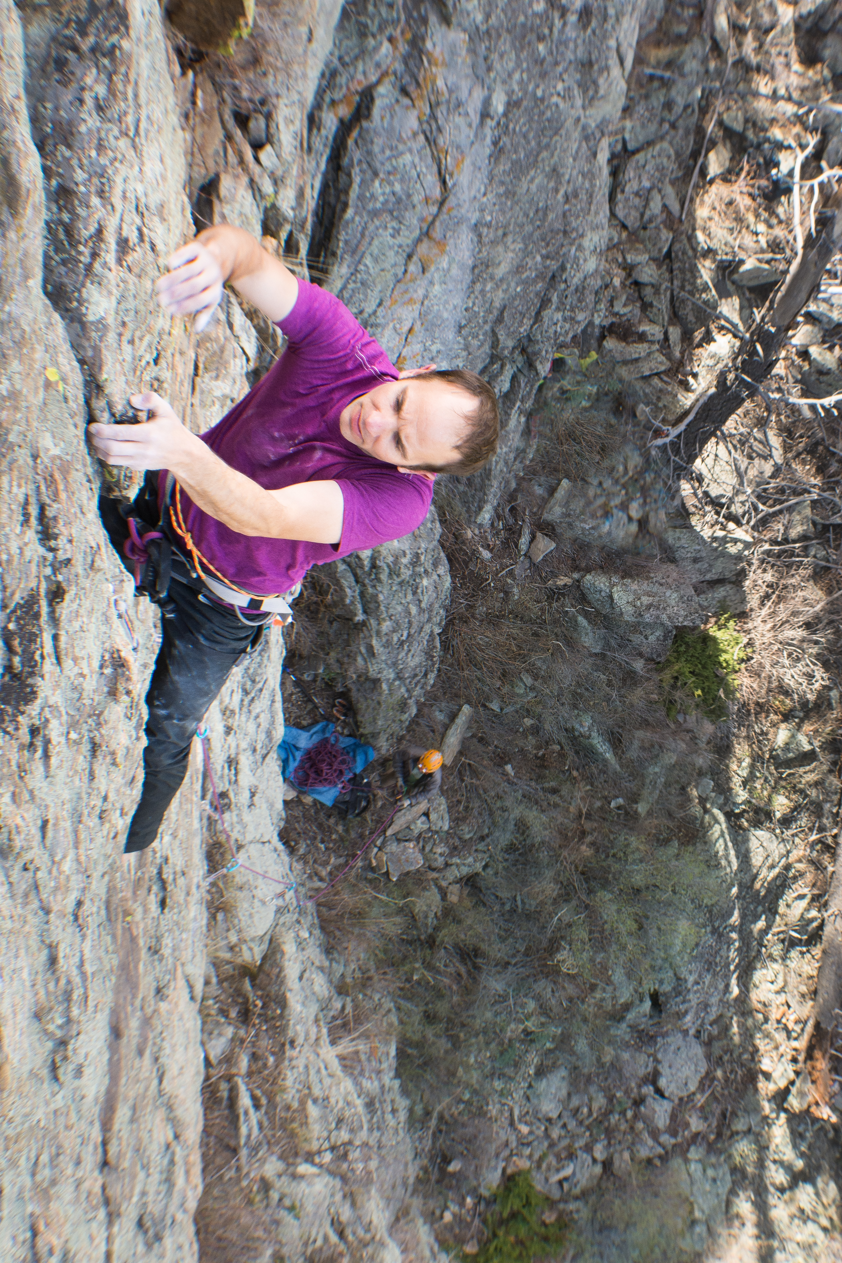 Earlier this year I finally hiked up the impressively long and steep hillside to investigate the crag. Although most of the cliff was too broken or low-angled to be of interest to me, I found a couple walls with great rock and some interesting features. Just as importantly, I discovered a much better approach.