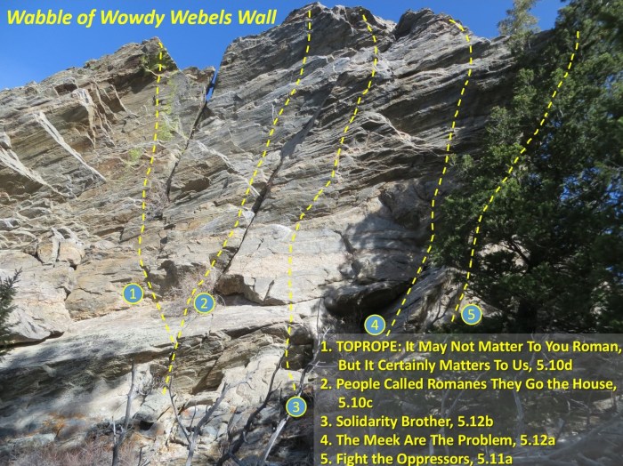 The southern sector (“Wabble of Wowdy Webels Wall”) is much shorter, but overhanging, with bullet stone, littered with incut edges. These routes are all excellent despite their brevity. The two 5.12s climb on incredible rock, featuring fun, dynamic boulder problems to reach the lip of the overhang. The best line on this sector is probably Fight the Oppressors, which climbs the stunning, jutting arête on the far right edge of the wall. The prow overhangs on both sides, but thanks to perfectly positioned incut jugs, the difficulty is never much harder than 5.10.