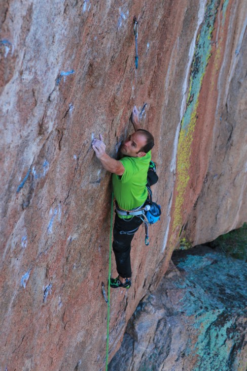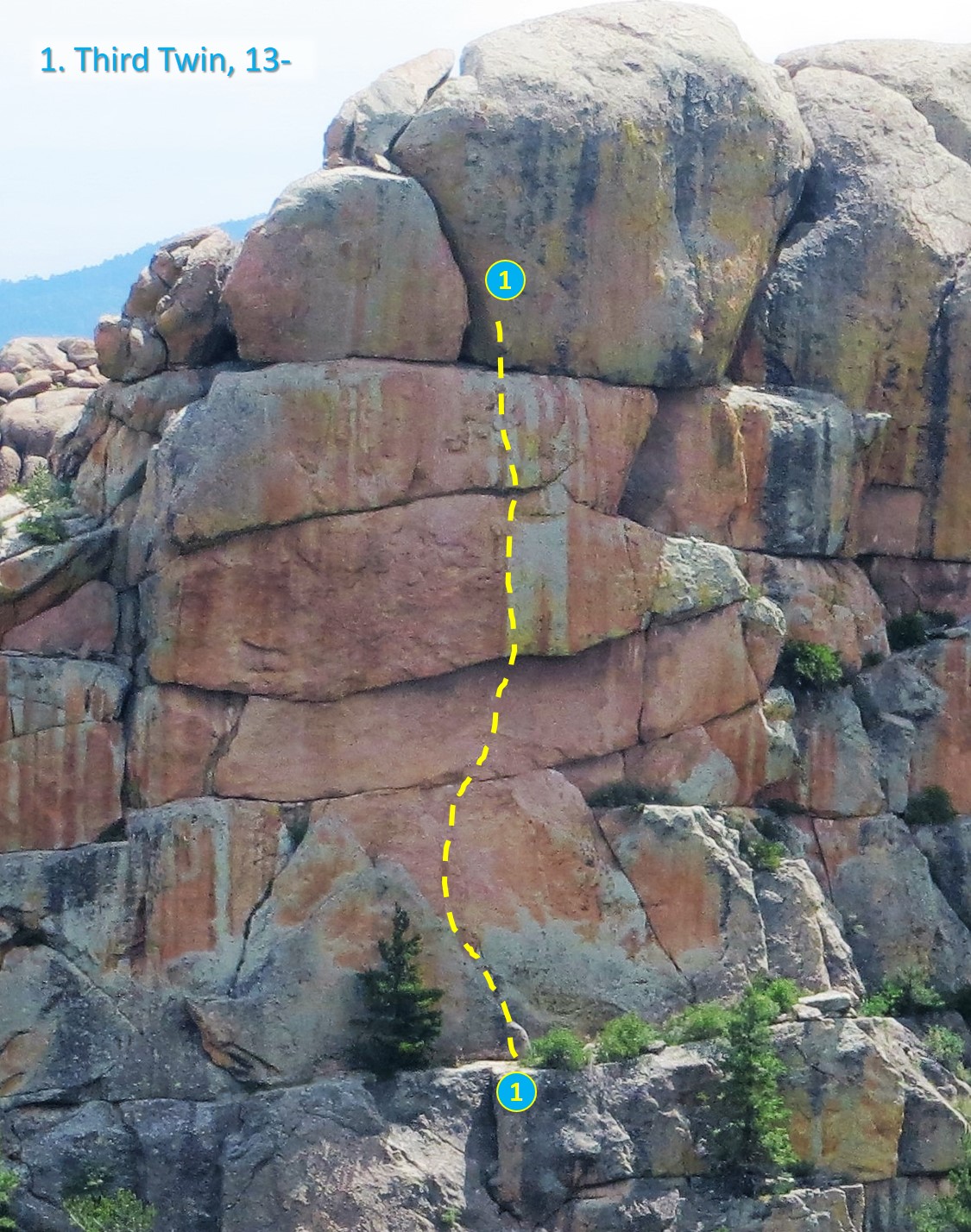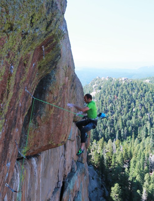 I first visited The Sidewalk with Tod Anderson in May to try a project he had started on the far left end of the wall. We finished equipping the line and sent it a few days later. Third Twin is basically a super-steep slab of tiny edges and divots to an 18”-deep roof. The slab is composed of impeccable cream granite, hands-down the best I’ve seen in Colorado. The business is oozing up this slab—great training for El Cap free-climbing. There’s a hard slap pulling the roof, followed by a few bolts of sustained patina edging before the difficulty eases.