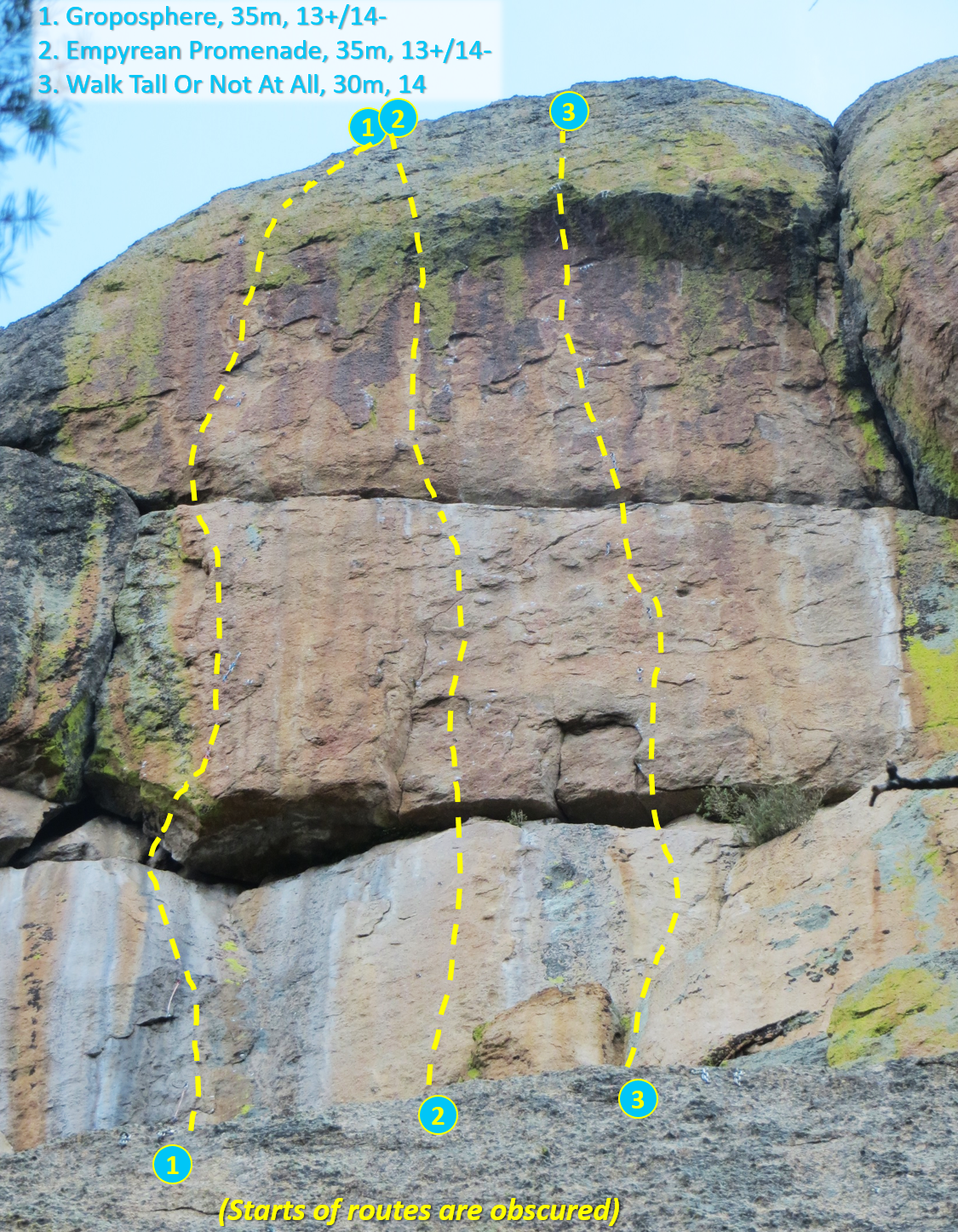 I prepped a trio of lines on this feature and set to work unlocking the moves. All three lines are excellent and compelling in their own way. The left-most line, Groposphere, has the best rock and most consistently difficult climbing, offering three distinct crux sections split by no-hands stances. The difficulties begin with balance-y, technical climbing up an unusual swath of water-polished granite. The next and hardest section involves a burly, dynamic roof pull, followed by sustained, sequential edging up a subtle pillar. The final panel hosts a pumpy dash through gently overhanging patina.