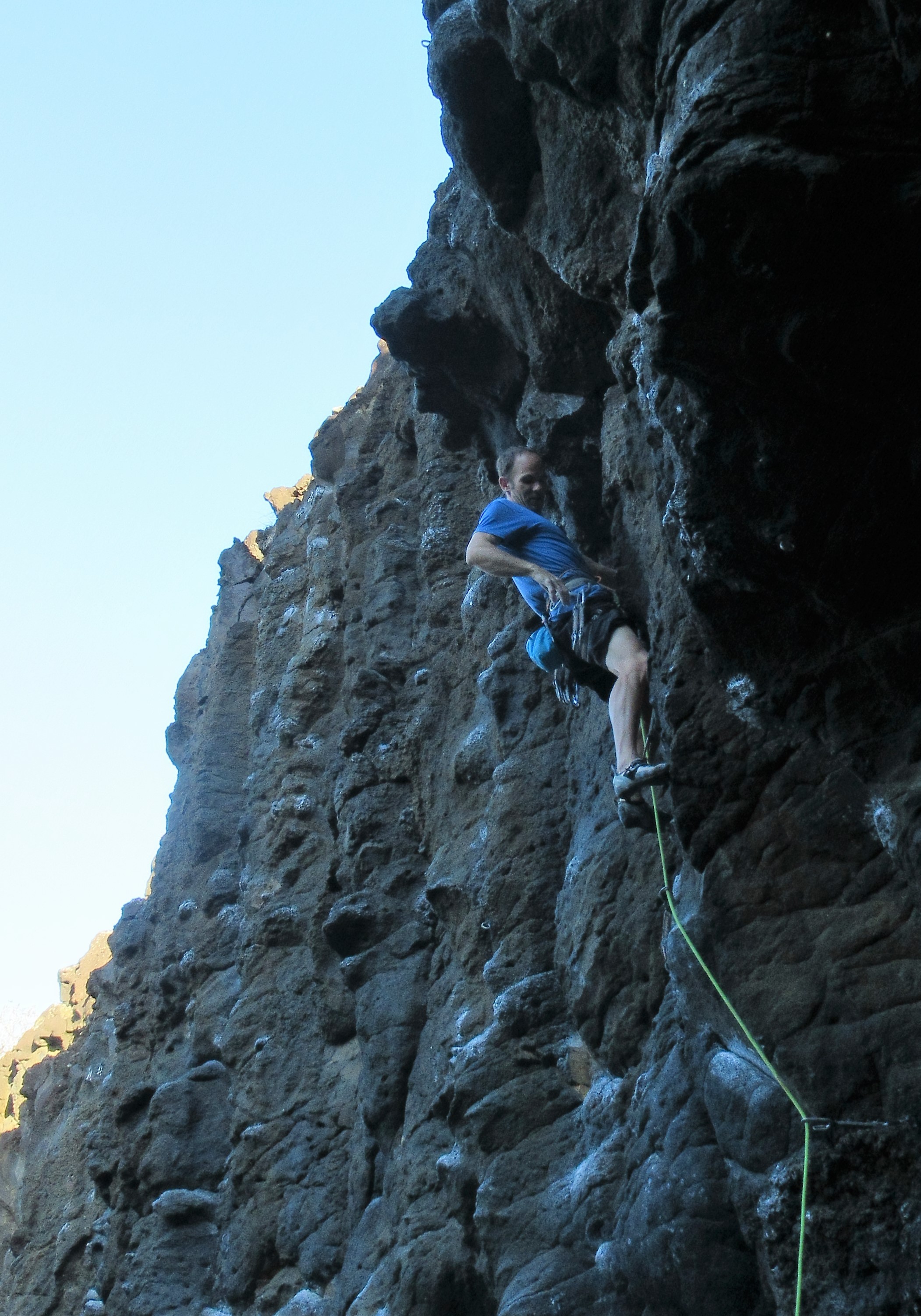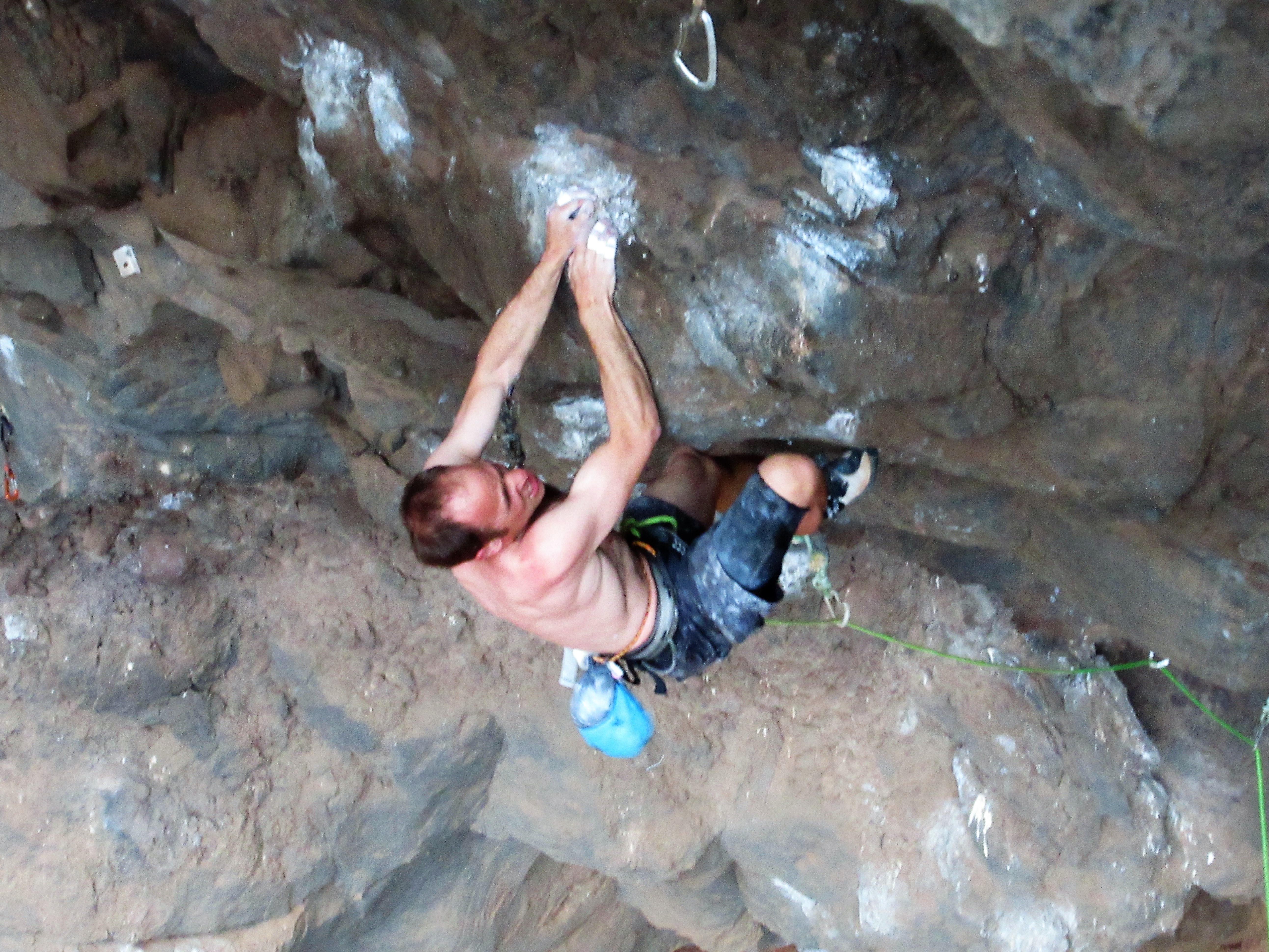 After a nice long break to cool down, I jumped on a brilliant 5.13b that climbed out the center of the cave. This was the type of climb that would be a 4-star classic at any crag in the country, even the Arsenal. It was essentially a series of five boulder problems split by rests of varying value. The rock is nearly flawless, and sports some of the most unusual holds I’d ever encountered. The route gets going right off the ground with a burly boulder problem to reach the first bolt and a no-hands shake. In classic Smith Rock-style, the locals have elected to ignore this when considering the route’s difficulty, and instead refer to the next boulder problem as “Crux #1.” This crux comes after a questionable, scrunchy, power-sapping “rest,” and involves a big, committing move to a protruding jug and a tenuous sequence to unwind. “Crux #2” was even harder, with another long move to an incredibly featured hold, before a fun exit of interesting stems on killer rock.