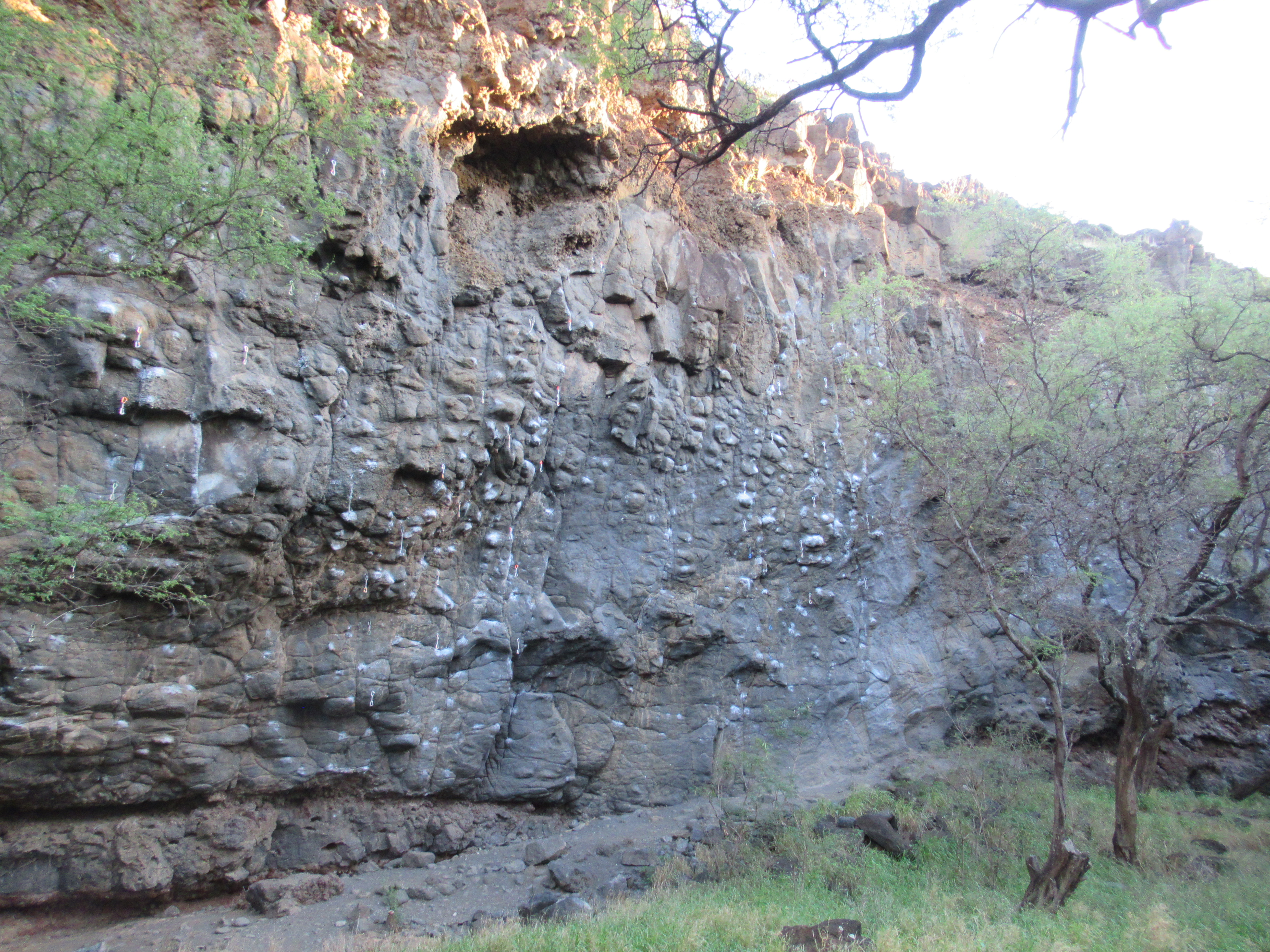 PK is a totally different experience than the cave we visited, and shows how varied Maui’s basalt can be. The cliff is more columnar and vertical, but it is covered in strange, bulbous mushrooms of protruding stone that climb a bit like tufas. The rock was impeccable and the setting was serene, right on the beach under a canopy of short trees. The climbing here was much more fingery and less physical—right up my alley.