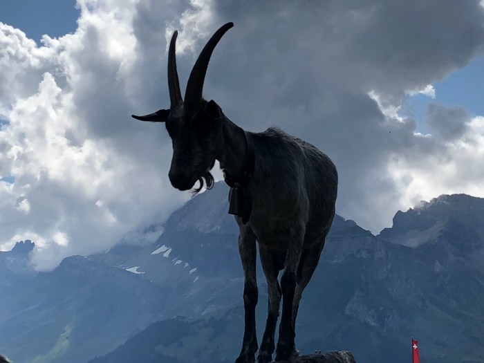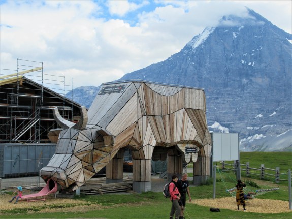 How would you describe this, other than a “Trojan Cow”? Kids climb up a ladder through the cow’s butt, and slide down its throat. That’s the north face of the Eiger in the background.