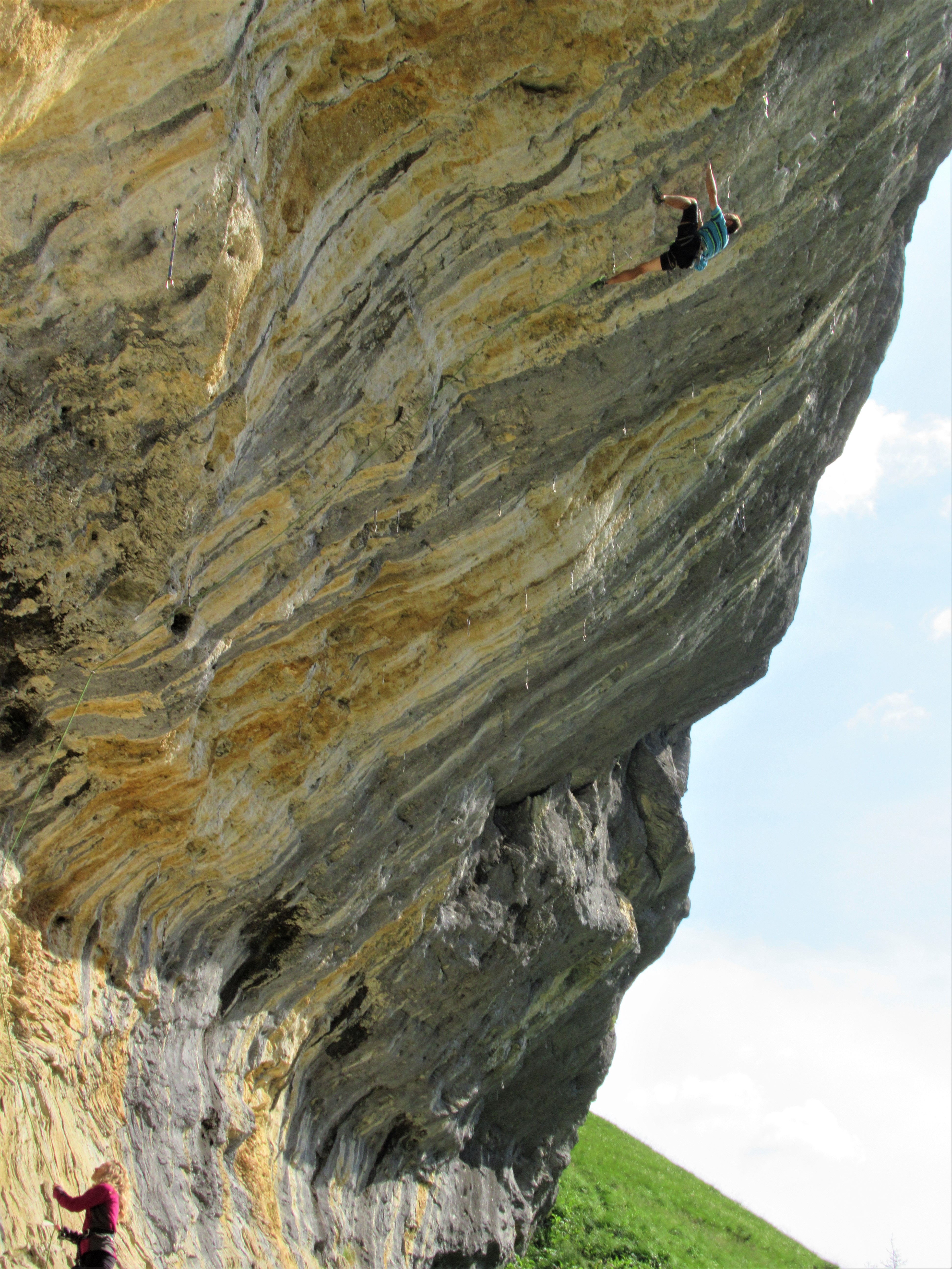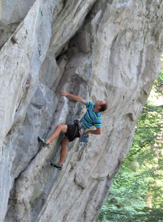 Next I tried Teufelskuche, the crag’s other dry 7c+. This time it went a little better, but not by much. I couldn’t deny the quality of the rock, but frankly I wasn’t enjoying the climbing. When the climbing is awkward, its hard to know if that’s due to the rock or the climber. This section of the cliff generally consisted of stacked, sloping rails that all slanted down to the left, such that the climbing was generally slopey liebacking with all the footholds sloping away. I was constantly battling against a left-ward barn-door and I never felt relaxed or comfortable.
