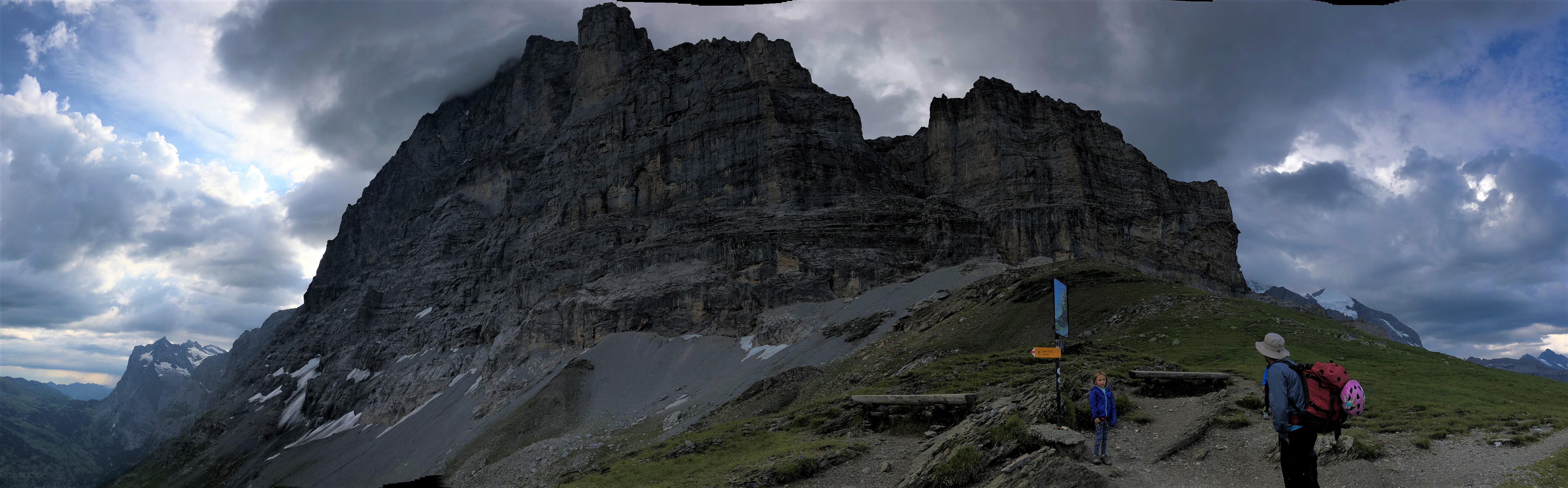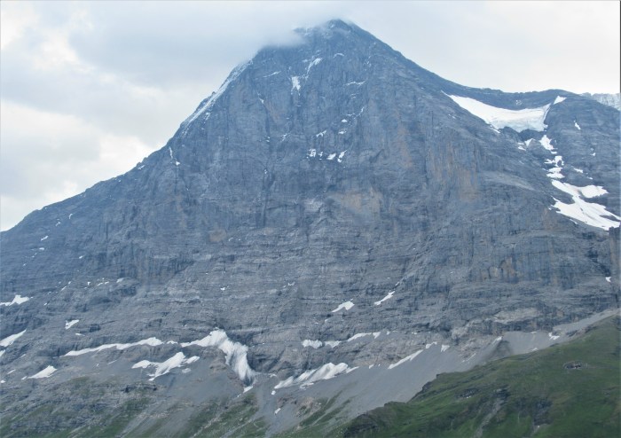 The Eiger Nordwand (aka Eigerwand) on the left, and the Eiger Rotstock on the right (with its summit just up and left of the signpost. The via ferrata more or less climbs the large gulley just right of the center of the photo.