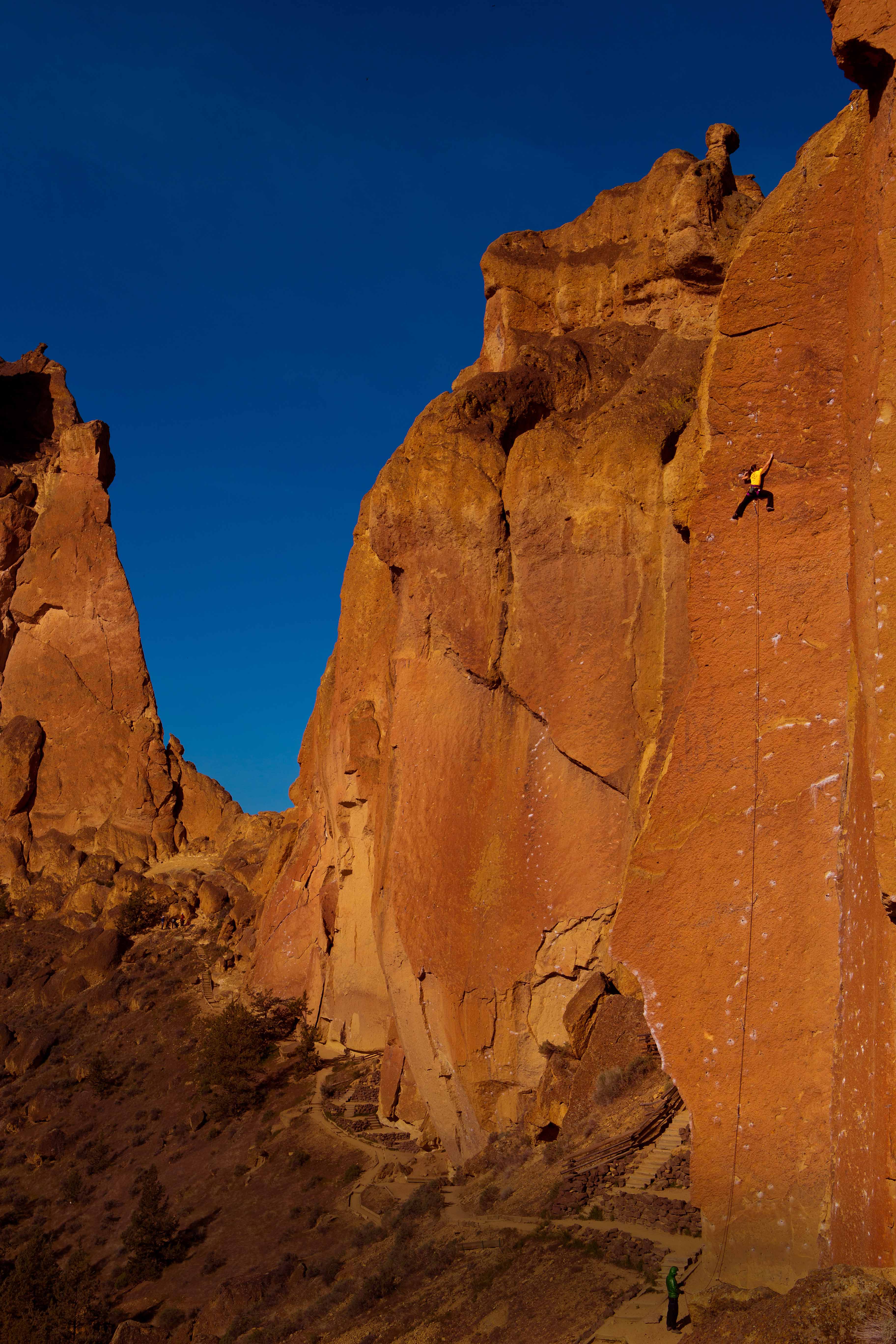Regardless of the chosen style, climbing is a skill-dependent sport. Routes like Darkness at Noon (5.13a) at Smith Rock require precise footwork and grip control. ©Mike Anderson